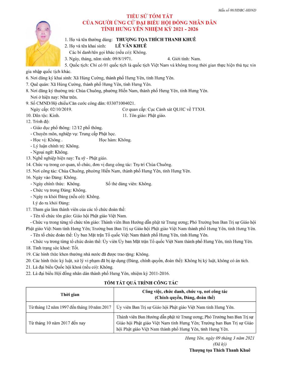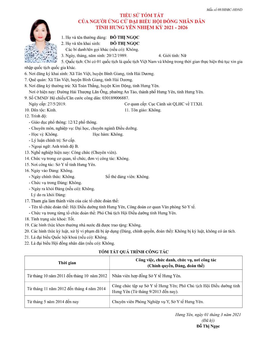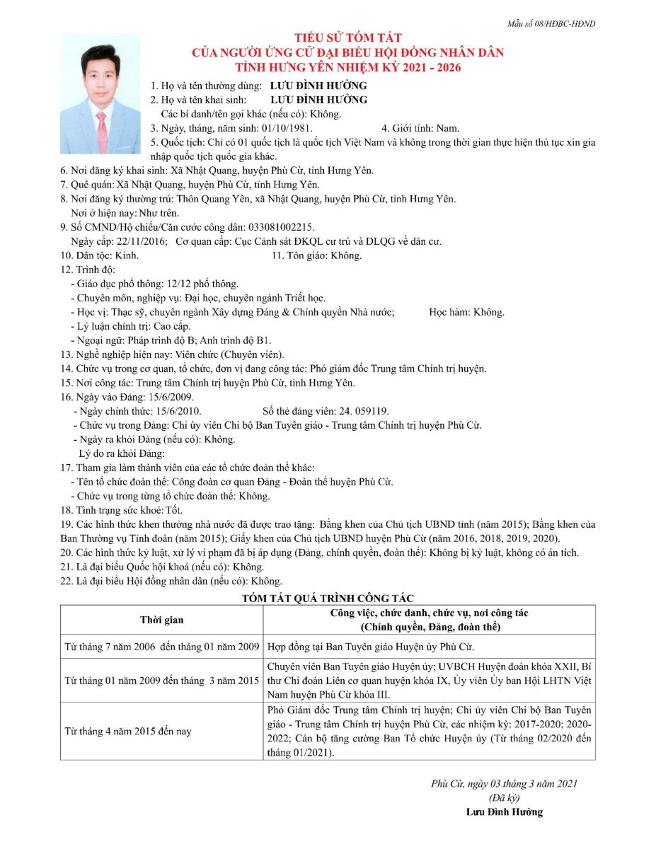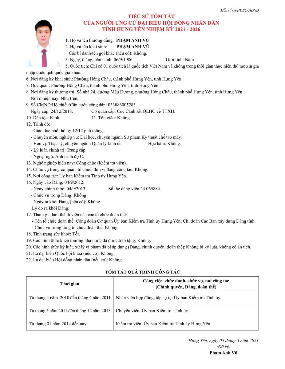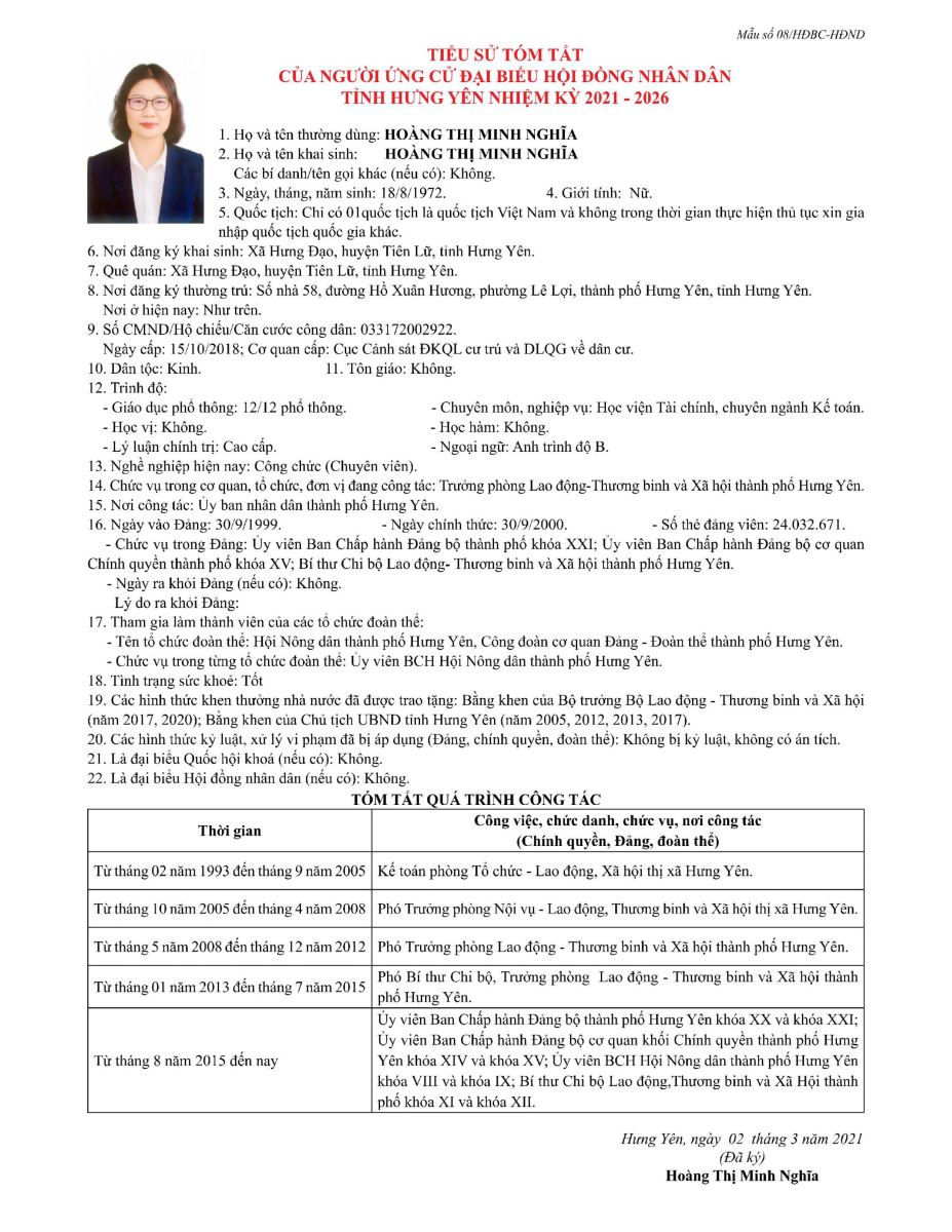 TIỂU SỬ TÓM TẮT CỦA NGƯỜI ỨNG CỬ ĐẠI BIỂU HĐND TỈNH HƯNG YÊN NHIỆM KỲ 2021-2026