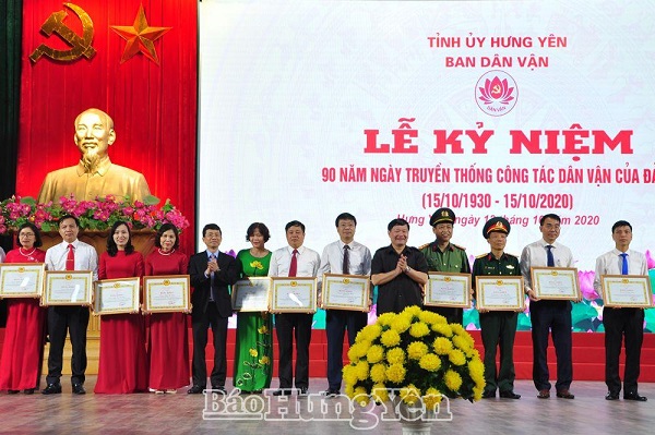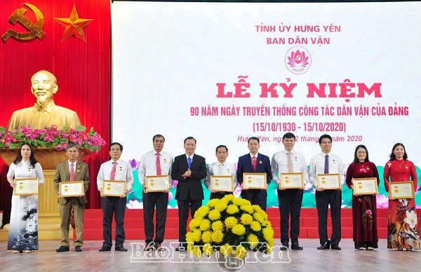 Trao Bằng khen của Ban Thường vụ Tỉnh ủy tặng các cá nhân có thành tích xuất sắc trong thực hiện phong trào thi đua “Dân vận khéo” Phát biểu tại lễ kỷ niệm, đồng chí Phó Trưởng ban Dân vận Trung ương Nguyễn Lam và đồng chí Phó Bí thư Thường trực Tỉnh ủy Nguyễn Duy Hưng biểu dương, chúc mừng những thành tựu mà hệ thống dân vận của tỉnh đã đạt được trong thời gian qua, góp phần quan trọng cùng với Đảng bộ, chính quyền và nhân dân trong tỉnh giành được nhiều thành tựu to lớn trên tất cả các lĩnh vực. Đồng chí Phó Bí thư Thường trực Tỉnh ủy Nguyễn Duy Hưng đề nghị: Trong thời gian tới, hệ thống dân vận các cấp trong tỉnh tiếp tục học tập, tuyên truyền, phổ biến, quán triệt bài báo “Dân vận” và tư tưởng dân vận của Chủ tịch Hồ Chí Minh đến cán bộ, đảng viên và các tầng lớp nhân dân; chú trọng khâu làm theo đạo đức, tác phong dân vận của Bác Hồ; tăng cường công tác dân vận chính quyền, tạo sự đồng thuận của nhân dân; đẩy mạnh phong trào thi đua “Dân vận khéo” gắn với các phong trào thi đua yêu nước; tuyên truyền, nâng cao nhận thức, vai trò trách nhiệm của các cấp ủy đảng, chính quyền, MTTQ và các tổ chức chính trị - xã hội trong thực hiện công tác dân vận; thực hiện tốt quy chế dân chủ ở cơ sở; chú trọng tham mưu công tác tôn giáo; quan tâm giải quyết lợi ích chính đáng, nhu cầu bức thiết của nhân dân…
