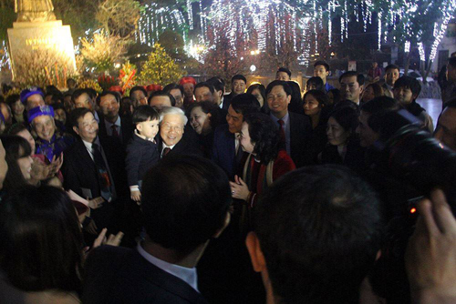 Trong không khí ấm áp của thời khắc sắp bước sang năm mới, Tổng Bí thư Nguyễn Phú Trọng đã đi bộ quanh bờ Hồ Gươm, trò chuyện với các công nhân môi trường đang làm nhiệm vụ, ân cần thăm hỏi, chúc Tết bà con nhân dân và du khách tham quan tại đây.