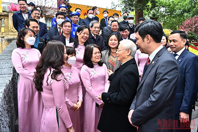 Tổng Bí thư Nguyễn Phú Trọng chúc Tết cán bộ, nhân viên Khu Di sản Hoàng thành Thăng Long.