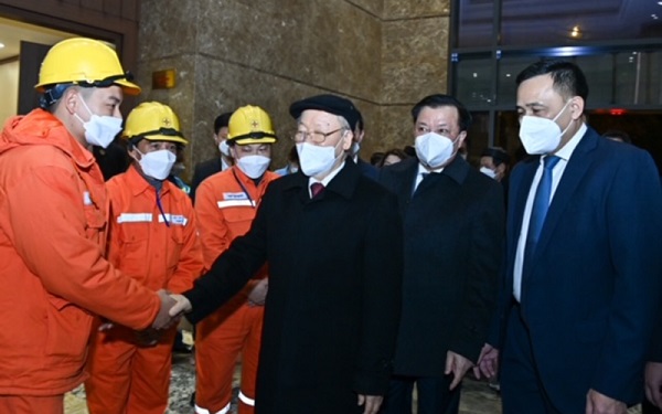 Tổng Bí thư Nguyễn Phú Trọng chúc Tết công nhân Điện lực Thủ đô. (Ảnh: Duy Linh)