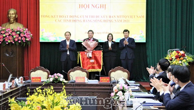 Đại diện Ban Thường trực Ủy ban MTTQ Việt Nam tỉnh Ninh Bình nhận cờ lưu niệm làm cụm trưởng thi đua Ủy ban MTTQ Việt Nam các tỉnh đồng bằng sông Hồng năm 2022