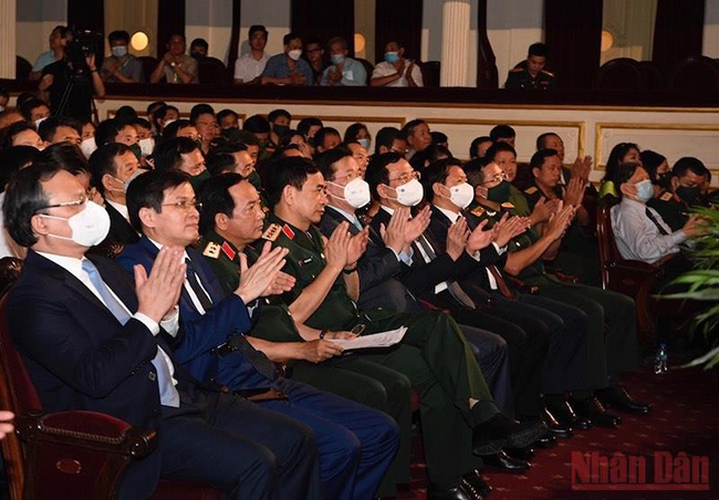 Thường trực Ban Bí thư Võ Văn Thưởng và Đại tướng, Bộ trưởng Quốc phòng Phan Văn Giang trao giải nhì cho các tác giả, nhóm tác giả.