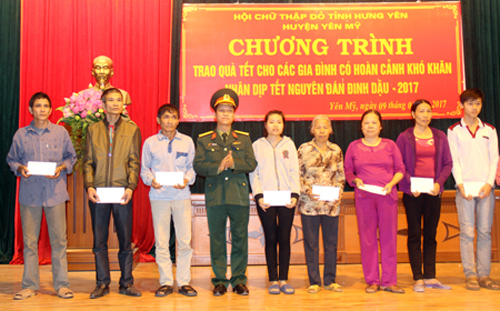 Nhân dịp Tết Nguyên đán Đinh Dậu 2017, ngày 9.1, Hội Chữ thập đỏ huyện Yên Mỹ tổ chức tặng quà tết cho 55 gia đình có hoàn cảnh khó khăn ở xã Trung Hưng và Ngọc Long mỗi hộ gia đình được tặng một suất quà trị giá 400 nghìn đồng.