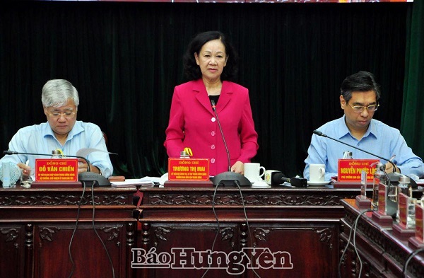Đồng chí Trương Thị Mai yêu cầu, các cấp ủy đảng, chính quyền, MTTQ và các tổ chức chính trị - xã hội cần làm tốt công tác tuyên truyền, phổ biến rộng rãi các văn bản mới của Đảng về công tác dân vận để cán bộ, đảng viên và nhân dân biết, tham gia thực hiện; chú trọng đổi mới phương thức công tác làm dân vận ở các cấp; tăng cường đối thoại, xử lý kịp thời những vấn đề nhạy cảm; tiếp tục củng cố khối đại đoàn kết toàn dân tộc; xây dựng hệ thống chính trị trong sạch, vững mạnh; tăng cường mối quan hệ mật thiết giữa Đảng với nhân dân... Đồng thời mong muốn tỉnh Hưng Yên tiếp tục thực hiện tốt công tác dân vận của Đảng, là điển hình cho các địa phương khác trong cả nước học tập…