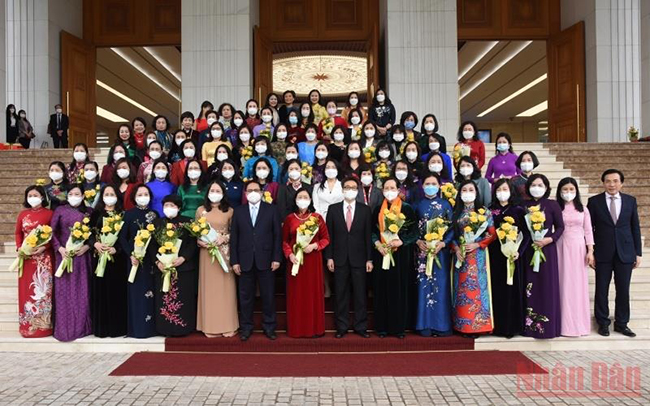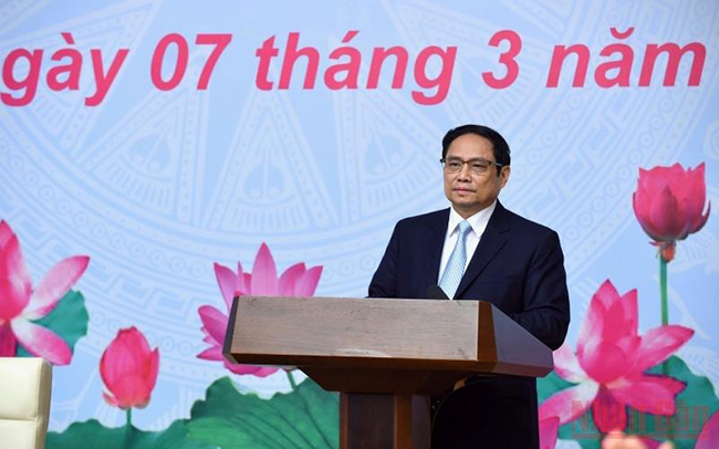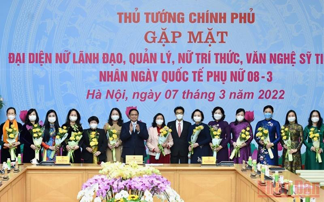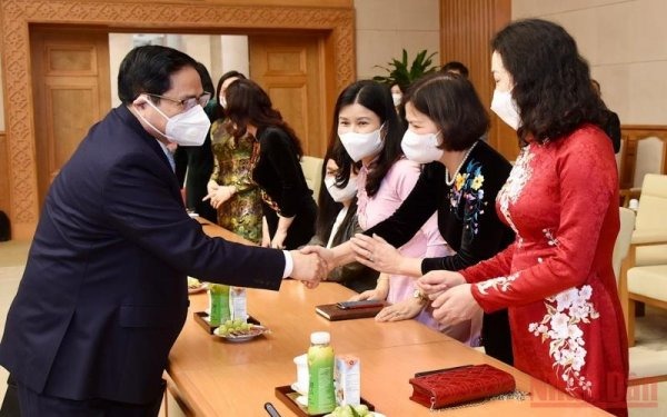 Thủ tướng Phạm Minh Chính chúc mừng Ngày Quốc tế Phụ nữ 8/3. Ảnh: TRẦN HẢI