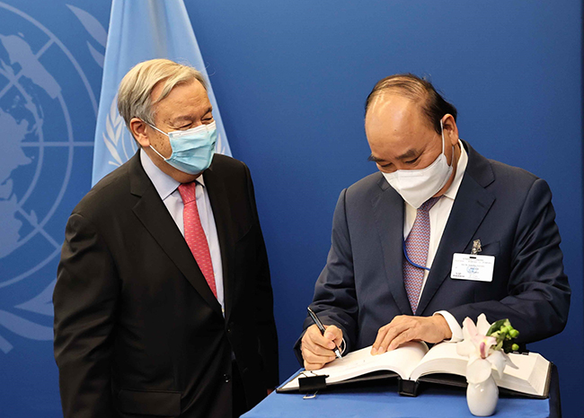 Ủy viên Bộ Chính trị, Chủ tịch nước Nguyễn Xuân Phúc ghi sổ lưu niệm tại cuộc gặp Tổng thư ký Liên hợp quốc Antonio Guterres ở trụ sở Liên hợp quốc, New York (Mỹ)_Ảnh: TTXVN