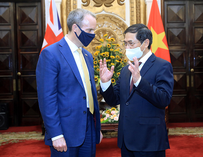 Ủy viên Trung ương Đảng, Bộ trưởng Bộ Ngoại giao Bùi Thanh Sơn với Bộ trưởng thứ nhất, Bộ trưởng Bộ Ngoại giao và Phát triển Liên hiệp Vương quốc Anh và Bắc Ireland Dominic Raab_Ảnh: TTXVN