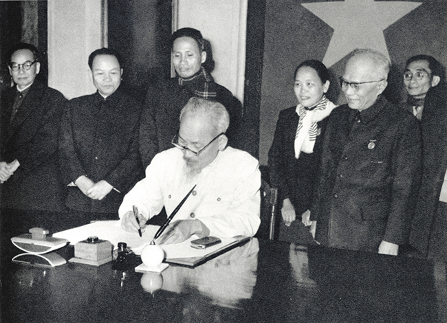 Ngày 1-1-1960, Chủ tịch Hồ Chí Minh ký sắc lệnh công bố Hiến pháp mới của nước Việt Nam Dân chủ Cộng hòa _Ảnh: TTXVN