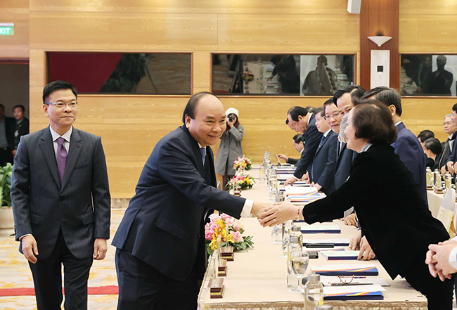 Ủy viên Bộ Chính trị, Thủ tướng Chính phủ Nguyễn Xuân Phúc với các đại biểu tham dự Hội nghị trực tuyến toàn quốc triển khai công tác tư pháp năm 2021, định hướng nhiệm kỳ 2021 - 2025 (tháng 12-2020) _Ảnh: TTXVN