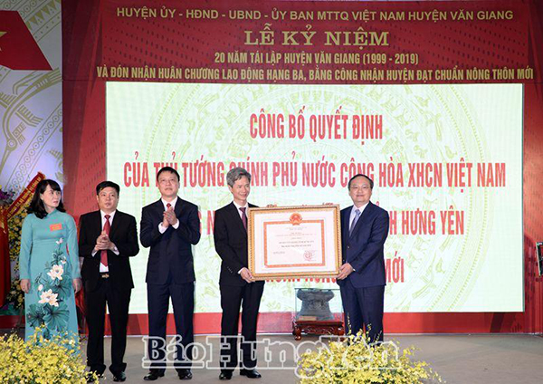 Nhân dịp này, thừa ủy quyền của Chủ tịch nước, đồng chí Đại tướng Tô Lâm, Ủy viên Bộ Chính trị, Bộ trưởng Bộ Công an đã trao Huân chương Lao động hạng Ba tặng nhân dân và cán bộ huyện Văn Giang; thừa ủy quyền của Thủ tướng Chính phủ, đồng chí Bí thư Tỉnh ủy Đỗ Tiến Sỹ trao Bằng công nhận huyện Văn Giang đạt chuẩn nông thôn mới tặng Đảng bộ, chính quyền và nhân dân huyện Văn Giang; đồng chí Chủ tịch UBND tỉnh Nguyễn Văn Phóng trao Cờ thi đua của UBND tỉnh tặng nhân dân và cán bộ huyện Văn Giang vì có thành tích xuất sắc trong phong trào thi đua Khối thi đua các huyện, thành phố năm 2018.