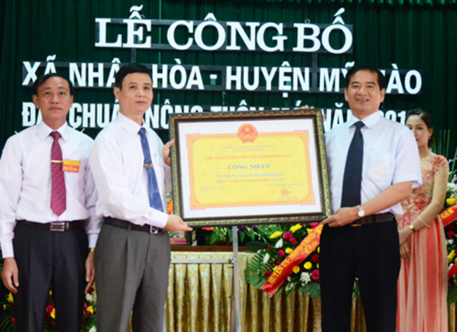 Phó Chủ tịch UBND tỉnh Đặng Ngọc Quỳnh trao Bằng công nhận xã đạt chuẩn nông thôn mới năm 2014 cho Đảng bộ, chính quyền và nhân dân xã Nhân Hòa