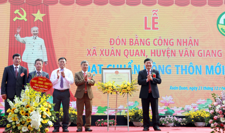 Tại buổi lễ, Chủ tịch UBND tỉnh Nguyễn Văn Phóng đã tặng hoa chúc mừng và trao Bằng công nhận xã đạt chuẩn nông thôn mới cho Đảng bộ, chính quyền và nhân dân xã Xuân Quan. Nhân dịp này, nhiều tập thể, cá nhân của xã Xuân Quan đã được các cấp khen thưởng.