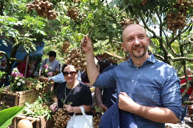 Du khách nước ngoài thăm vườn nhãn tại xã Hồng Nam (thành phố Hưng Yên)